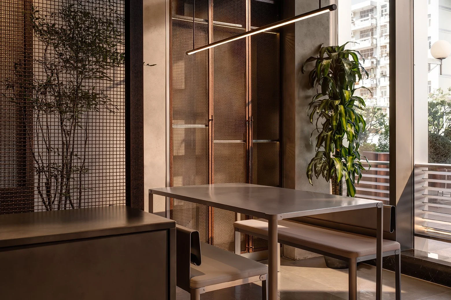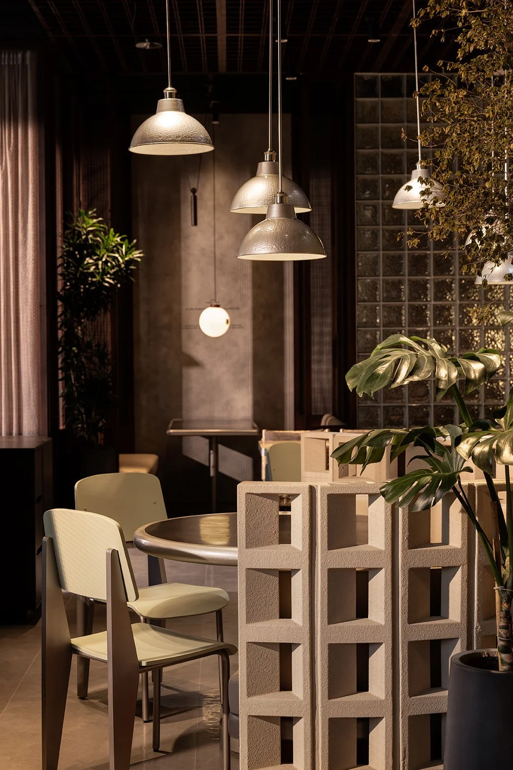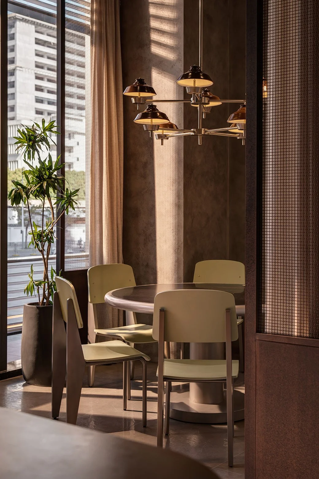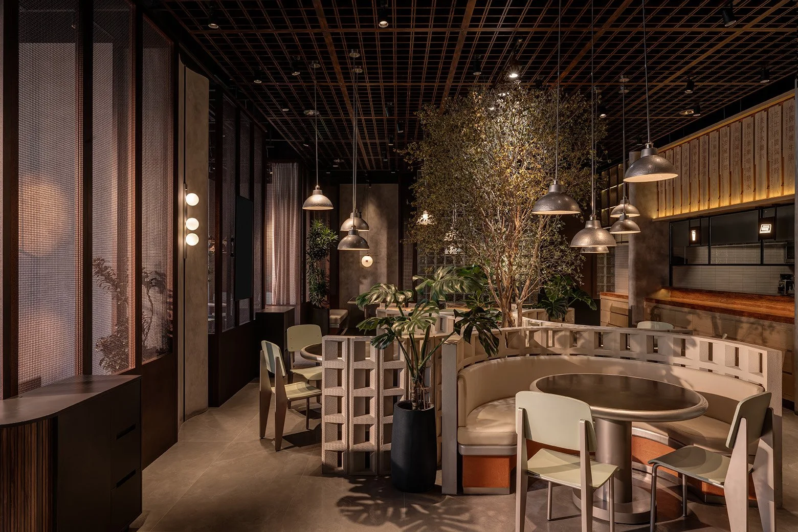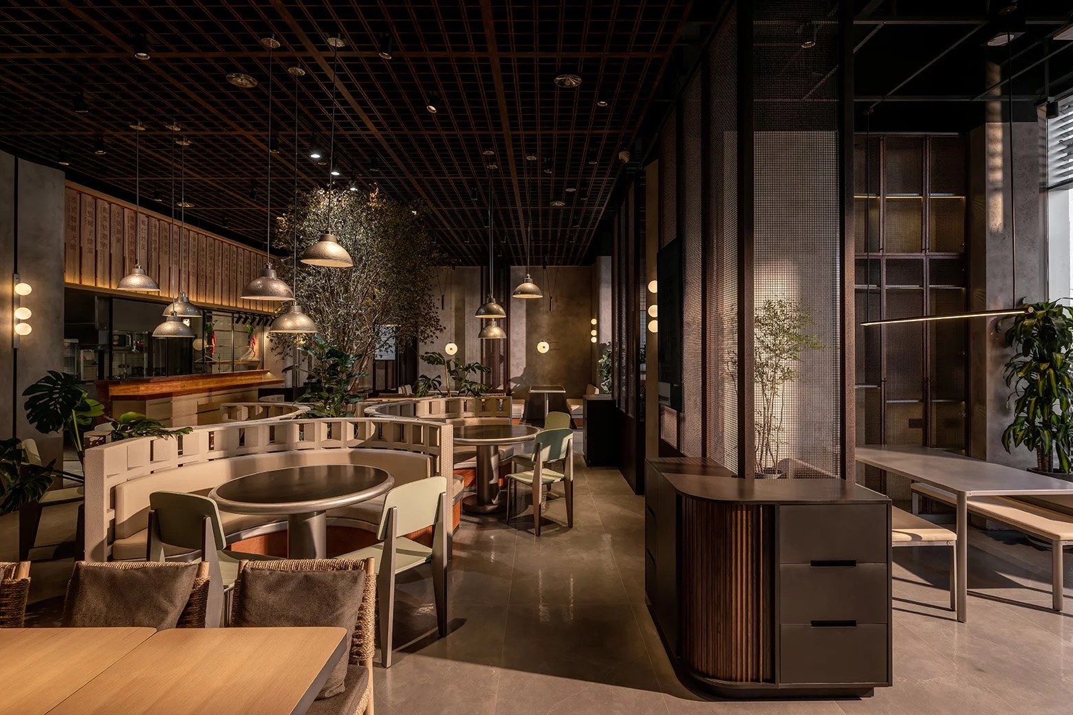 The Longhua district is home to a distinctive landscape, where an industrial area is surrounded by mountain trails. To embrace this duality, raw concrete, terracotta tiles, and sturdy metal frames are utilised in the restaurant showcases the district’s industrial nature. To honor the surrounding greenery and to soften the bold industrial elements, a sculptural tree is placed at the centre of the space, serving as a striking focal point, injecting liveliness into the environment. The overall interior design also subtly references an old industrial canteen, at the same time, infused with the cozy aesthetic of a modern coffee shop.
