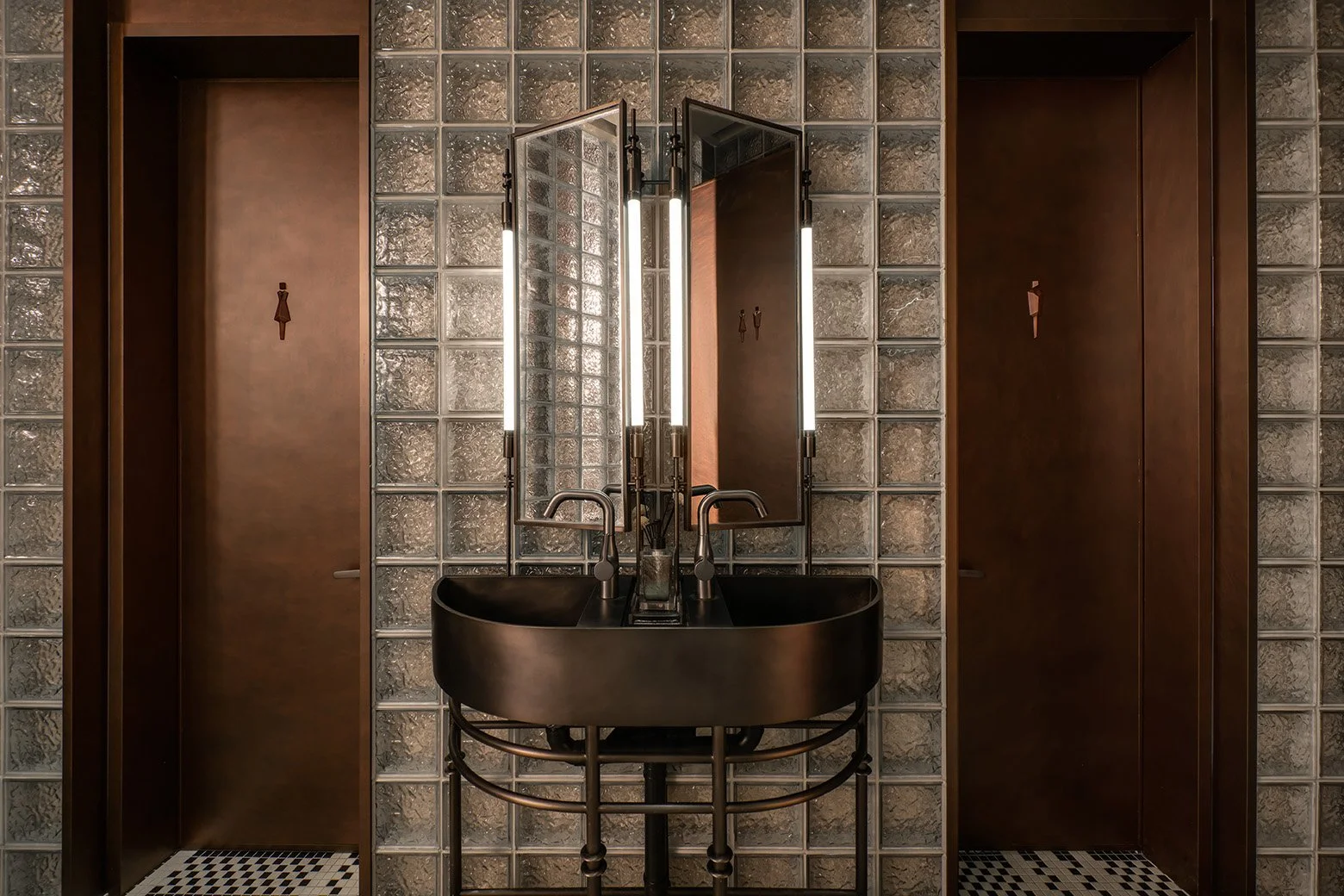 The meticulous industrial aesthetic used in the venue extends all the way into the bathroom, where exposed pipings and distinguished glass bricks create a refined yet rugged ambiance. The flooring are contrasted with hand laid mosaic to create a multi sensory experience.