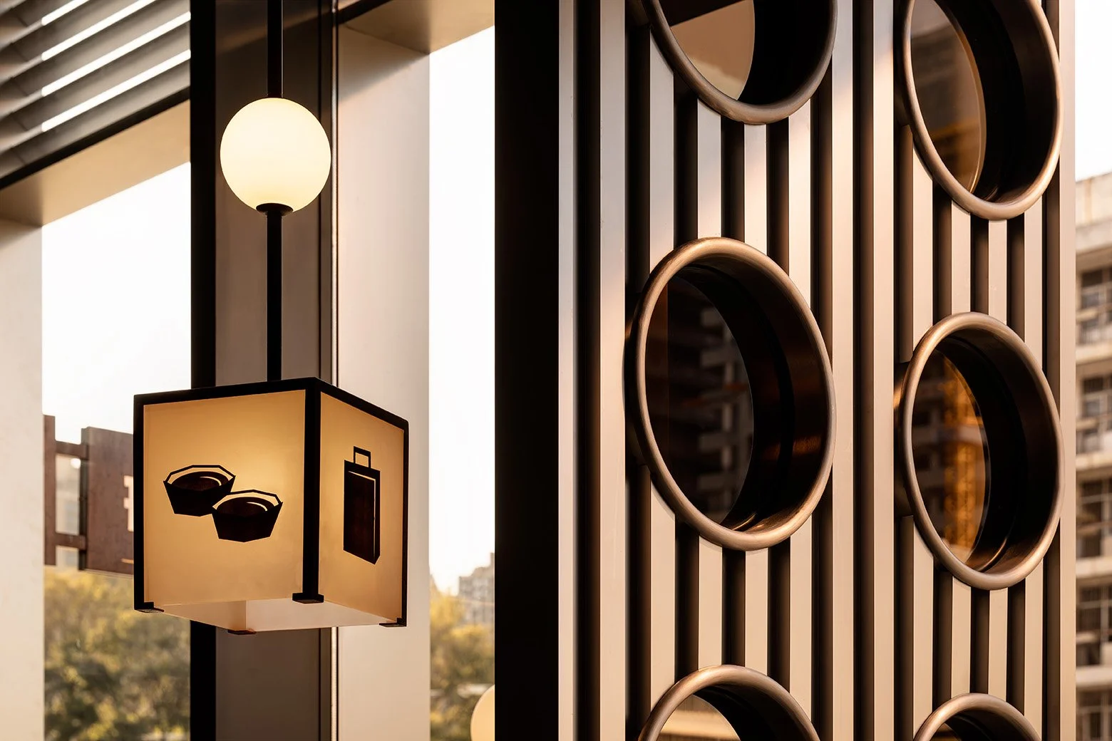 Deeply influenced by the tactile nature of industrial aesthetics, each furniture and lighting piece features custom metal accents and exquisite craftsmanship. The bespoke lighting is a particular highlight, including hand-hammered lampshades and crane-inspired lights where bulbs are balanced by counterweights, both echoing the industrial theme. In the private dining room, clay pot rice lid-inspired lights are to pay homage to Hong Kong’s culinary traditions and mirror the cuisine 3.3 has to offer.