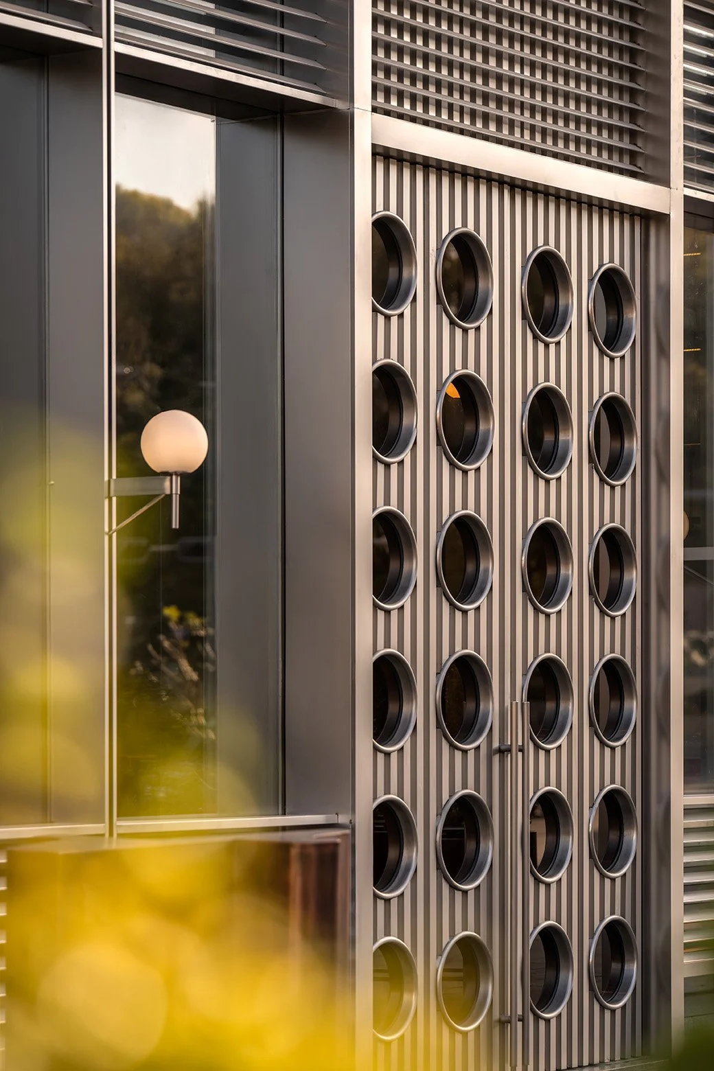 To create a striking impression from a distance, the facade is designed with contrasts. Stainless steel wraps the exterior of the restaurant and is balanced by circular windows that soften the industrial aesthetic. Upon entry, guests are greeted by a bespoke welcome counter made of oxidized steel, ensuring a warm greeting for every guest. The facade is subtly illuminated by LED lights and wall sconces, creating the perfect dining ambience both day and night.