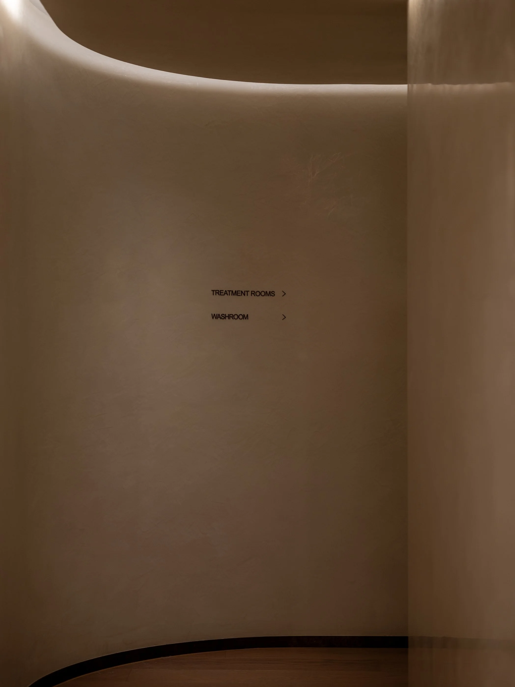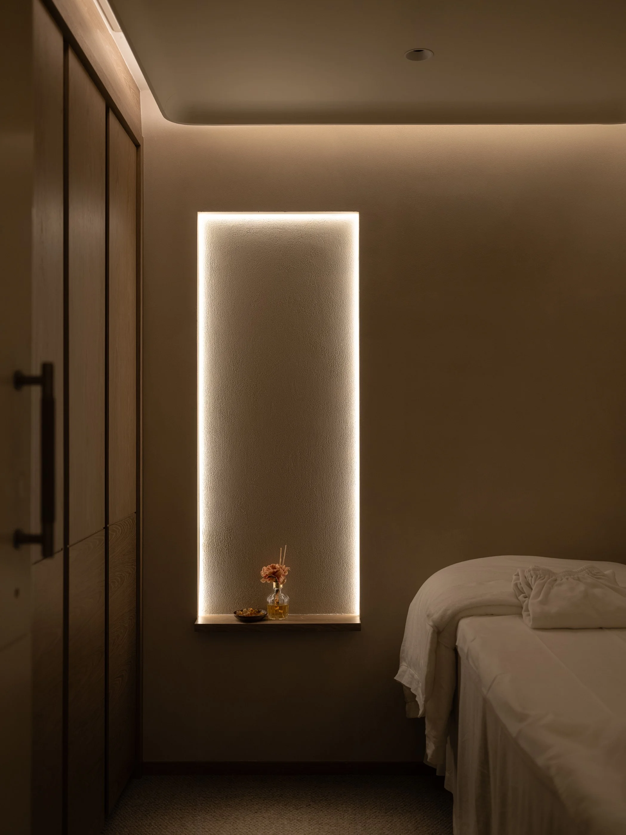 Each Treatment Room offers a distinct experience. The walls, painted in a soft sand hue are accented with weathered like timber veneer, bringing rustic warmth and natural comfort. Featuring a versatile lighting system that ranges from mood lights to operational lights, they cater to both relaxation and functionality. Some rooms are fitted with full height mirrors, expanding the visual space, while others are equipped with full-height wardrobes for convenient storage. Rooms lacking natural light are transformed with feature walls, designed to be decorated with scents and plants, adding a sense of characteristic.