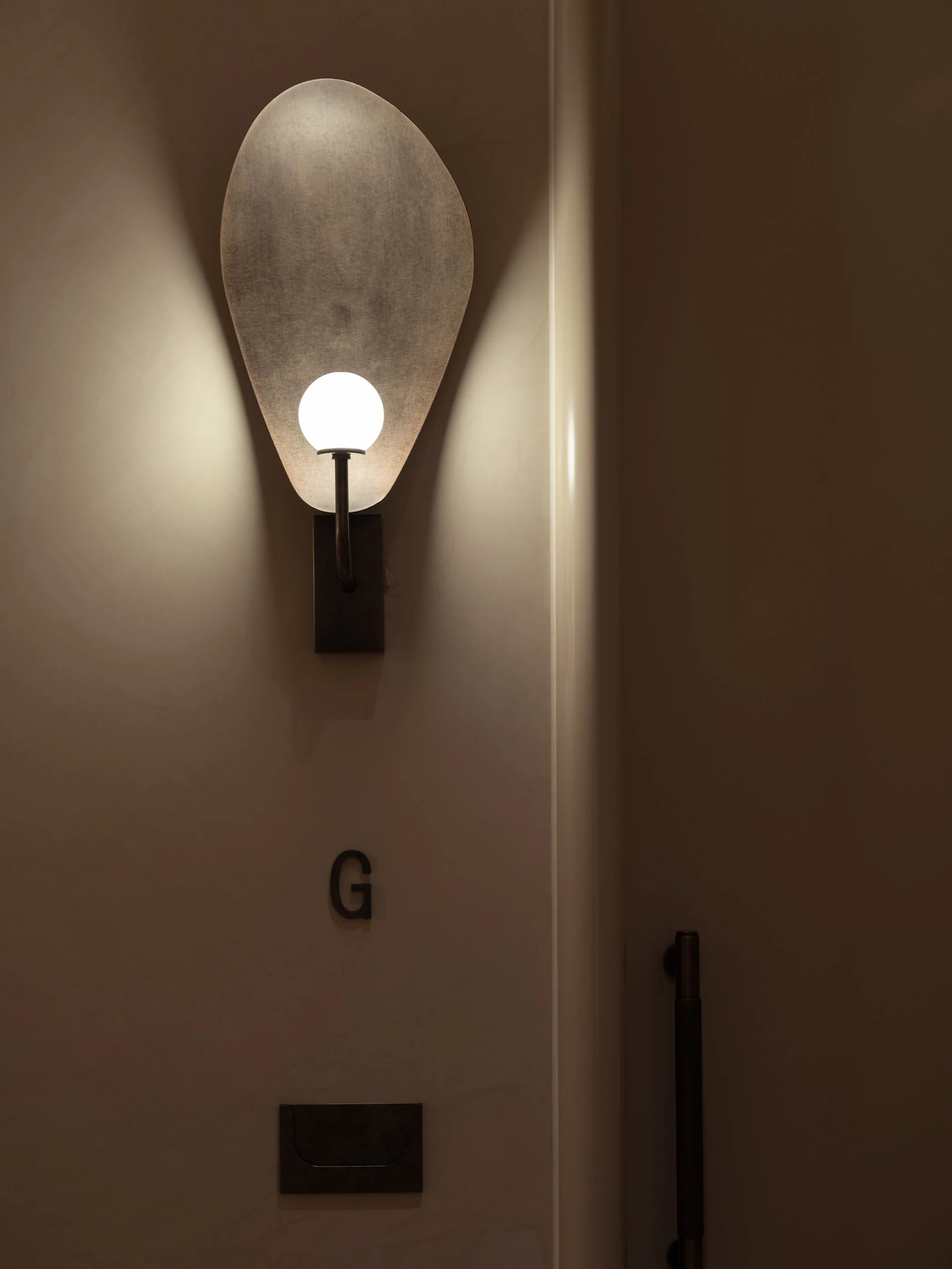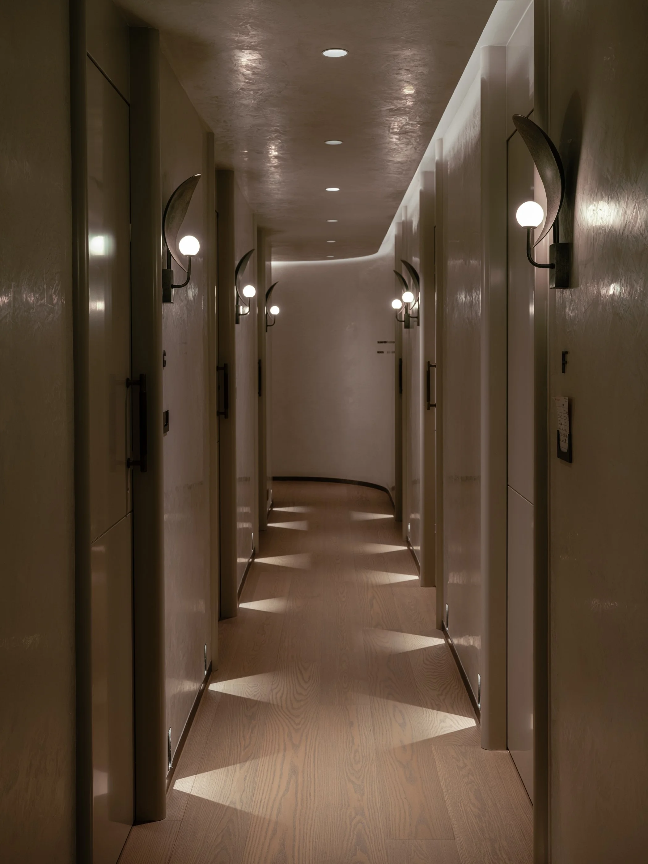 The long corridor elevates the narrative of opulence. Uplights cast a soft glow along the pathway, while bespoke, tulip-inspired lighting fixtures illuminate each doorway, welcoming visitors. The lacquer doors, designed with rounded corners, offer a contrast to the striking metal plaster lighting, creating a harmonious balance between texture and forms.