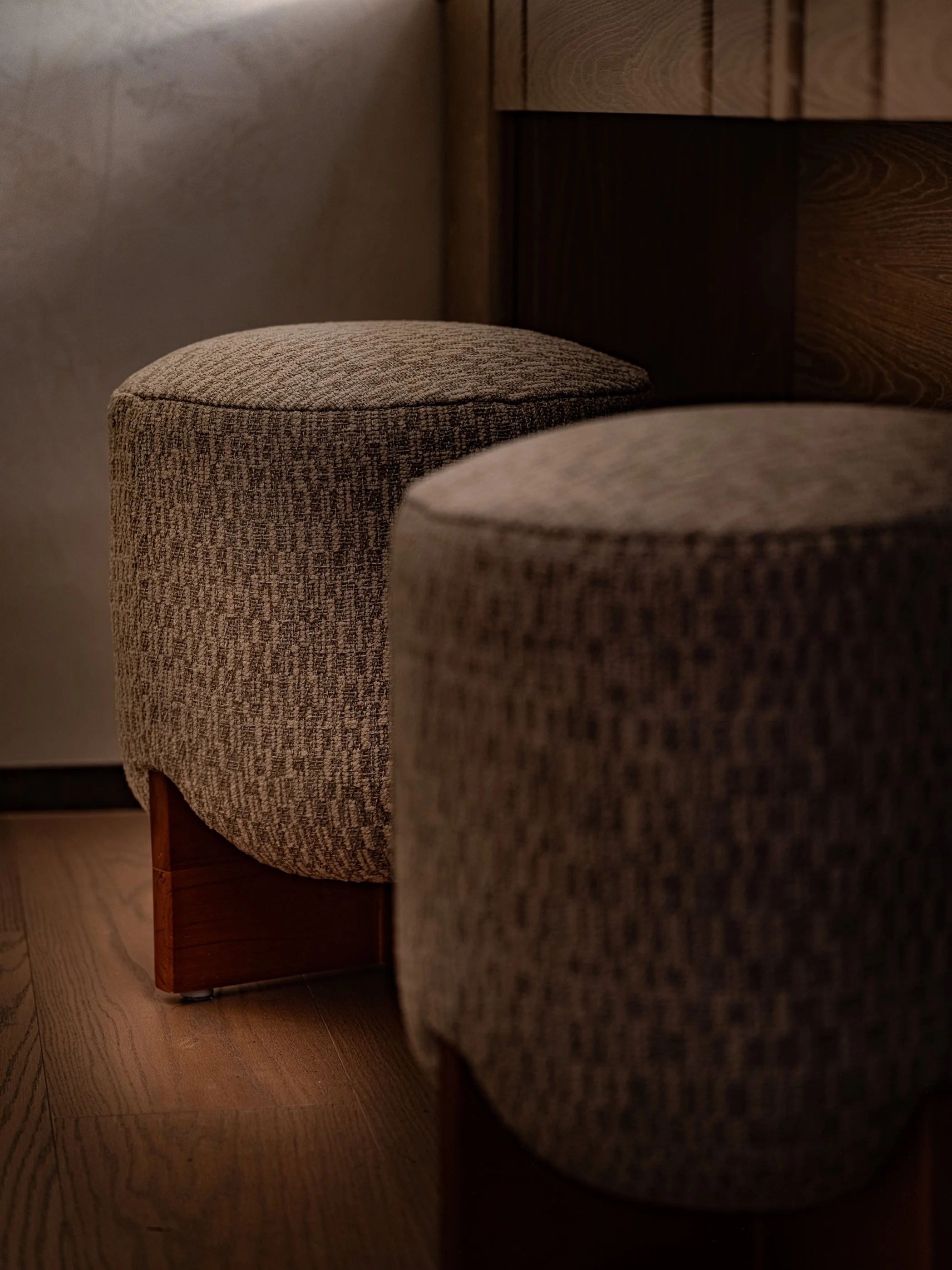 The Bathrooms and Make-up Vanity are designed with consideration to materials, texture and functionality. Travertine dominates the bathroom space, creating a sense of natural elegance. Spanish marble covers are adapted to the custom lighting fixtures with sophistication. Ample space is intentionally left on the countertops, allowing clients to add their personal touch. The vanity area is designed to fit two. The travertine detailing on the mirror joinery echoes with the space’s material palette. The fabric-covered stools add a playful personality to the sleek minimalism.