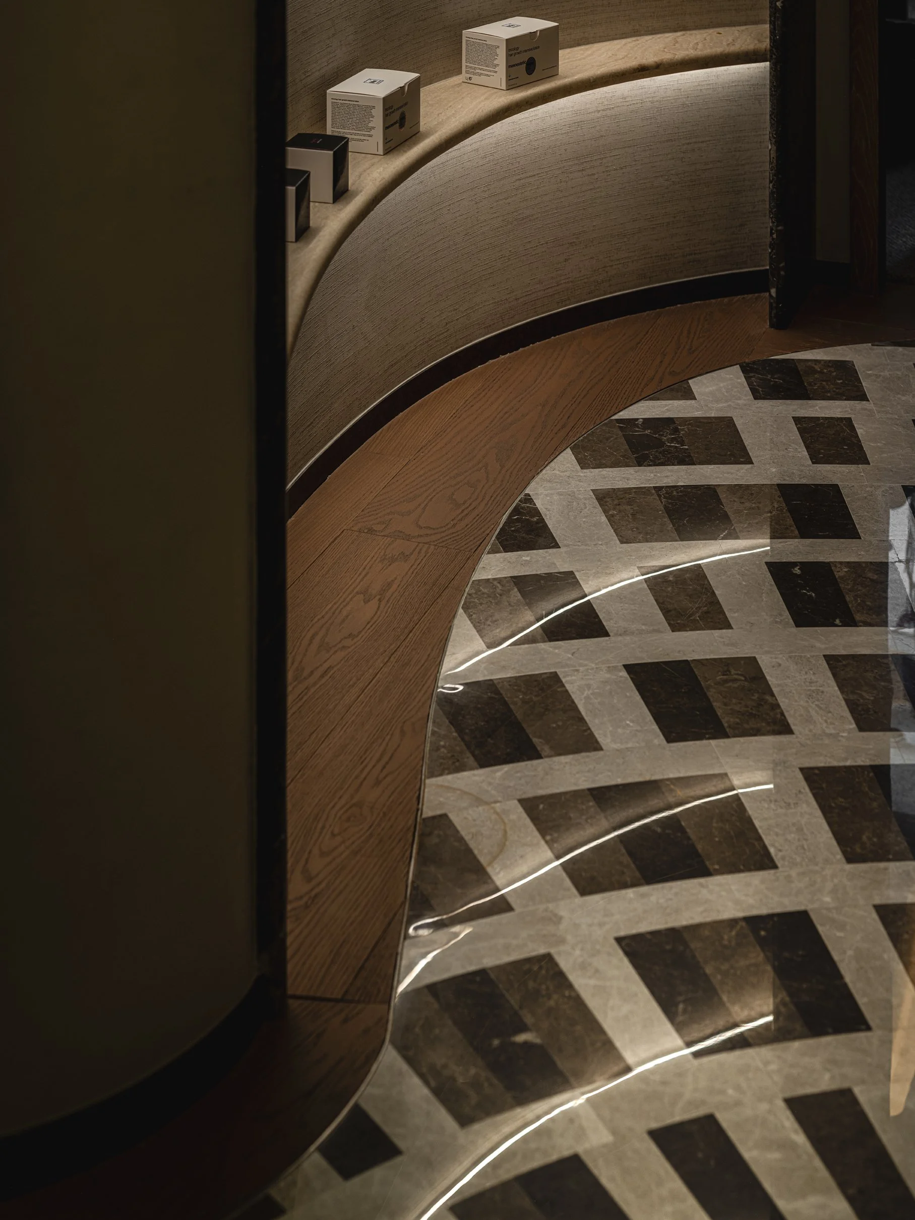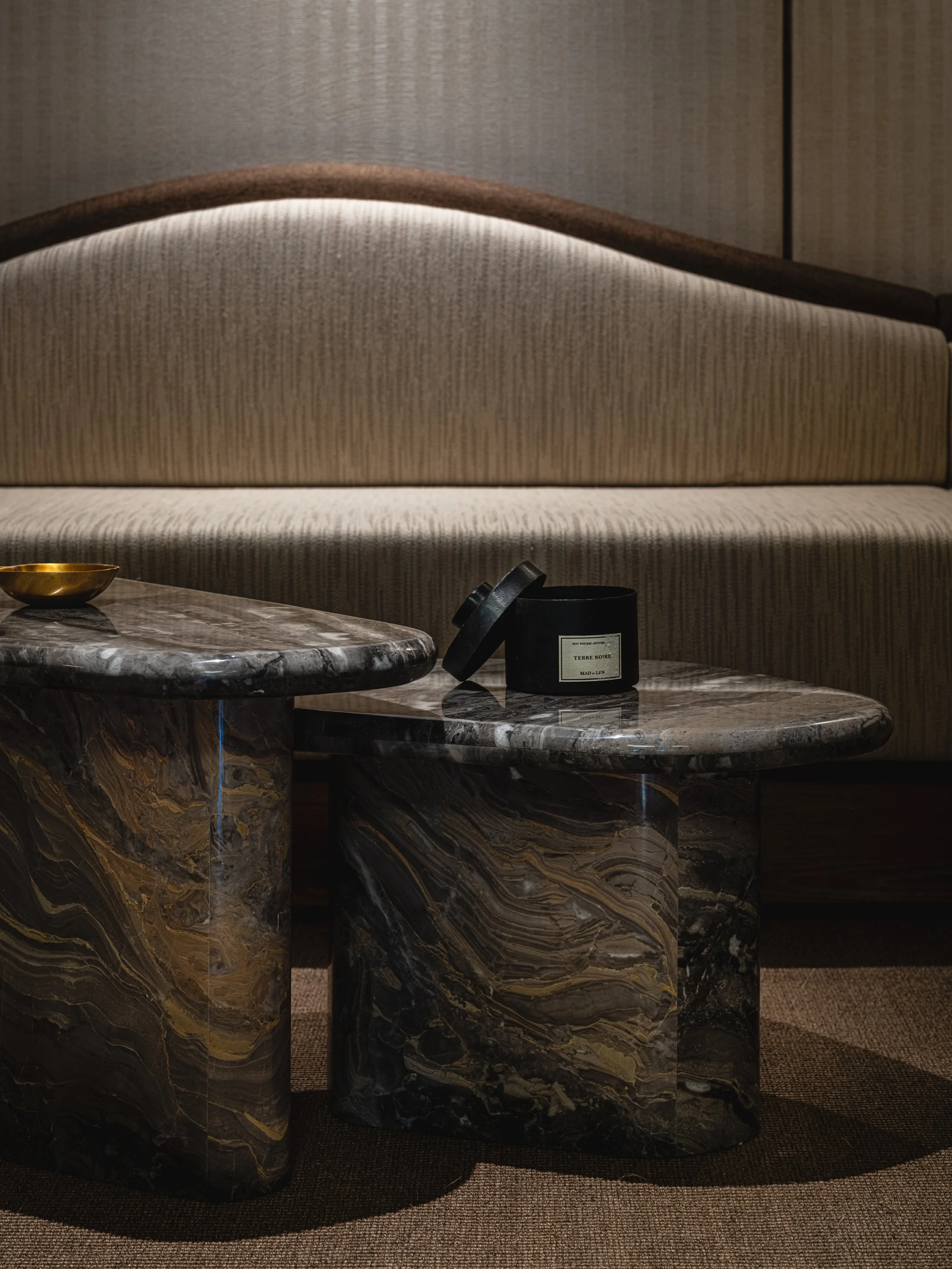 The reception area is thoughtfully divided into two main zones. To one side, the Waiting Area is a tranquil hideaway for visitors to relax with a cup of coffee or a magazine. Mirrors are cleverly placed to expand the space, while the curving back of the sofa creates an organic language. The bespoke coffee table, crafted from Elis Grey marble, alongside the soft sculptural bronze sconces, adds a touch of elegance. The imported fabrics and wall coverings provide tactility and luxuriousness, completing the space’s premium atmosphere.
