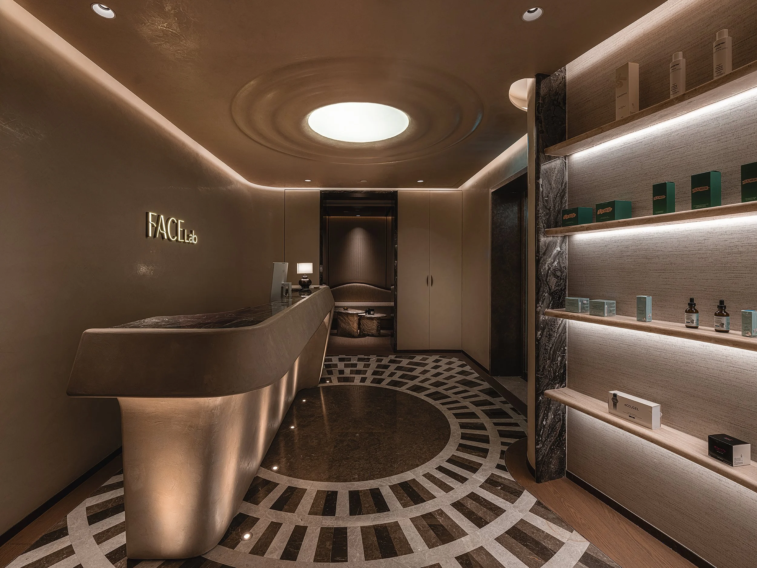 Opposite the Waiting Area is a display shelf, showcasing a range of products, from Face Lab’s own creations to those distributed by the brand. LED lighting is strategically placed to illuminate each item. Adjacent to the display, the Consultation Room offers a private experience where visitors can receive expert advice tailored to their specific needs. Inside, the Phillip Jeffries wallpaper creates a luxurious backdrop with its gold gradient. Moody sconces enhance the ambiance, mirroring the glamorous cityscape visible beyond.