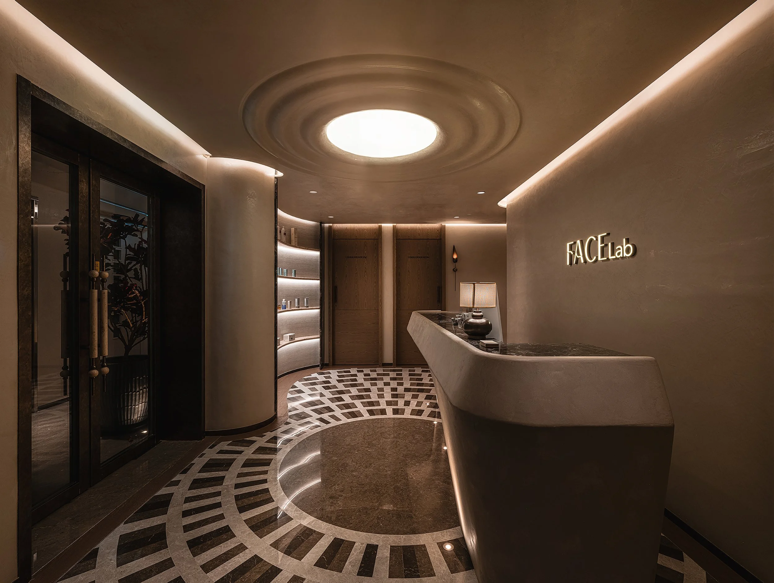 The ritualistic experience of Face Lab begins at the facade, encompassing the entire floor. Upon arrival, visitors are greeted by a custom-designed bench atop a marble floor, providing a convenient spot for shoe changing and storage without compromising aesthetics. Italian wall plaster, finished in gloss, creates an ambiance that shifts under varying light. From uplights to LEDs, the curated lighting scheme highlights the signage and creates an immersive atmosphere. Bespoke door handles with bronze accents radiate quiet luxury. Carefully selected vegetation and natural materials like travertine further reinforce the sense of retreat.