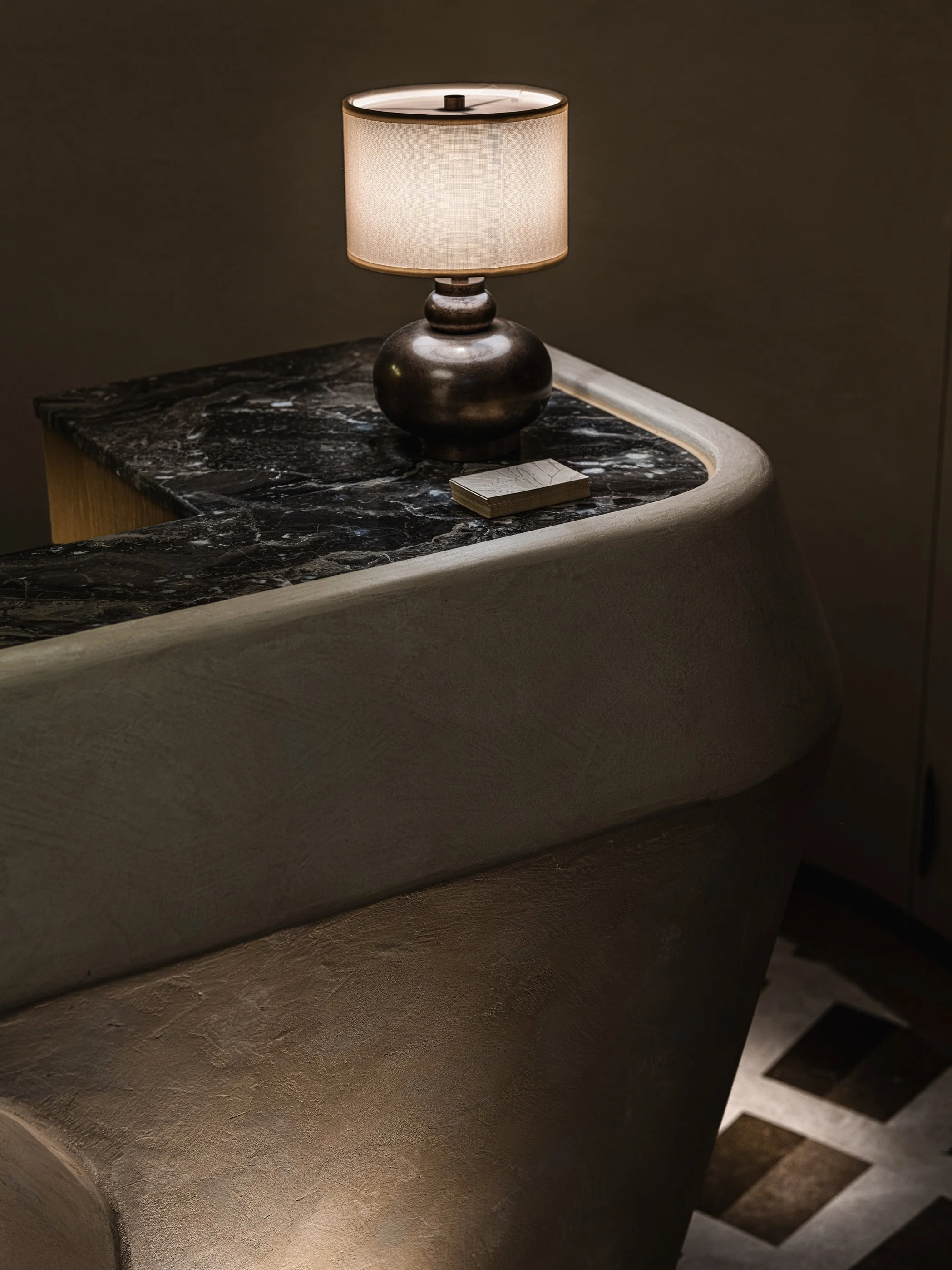 Stepping into the foyer, the floor makes a striking impression with its radiant stone pattern, echoing the dimmable barrisol ceiling, finished with custom plaster. The interplay of light and form draws the eyes to the artisan-crafted sculptural island made of smooth micro-cement, anchoring the space as the main reception. Uplights are precisely positioned, casting shadows to accentuate the island’s organic form.
