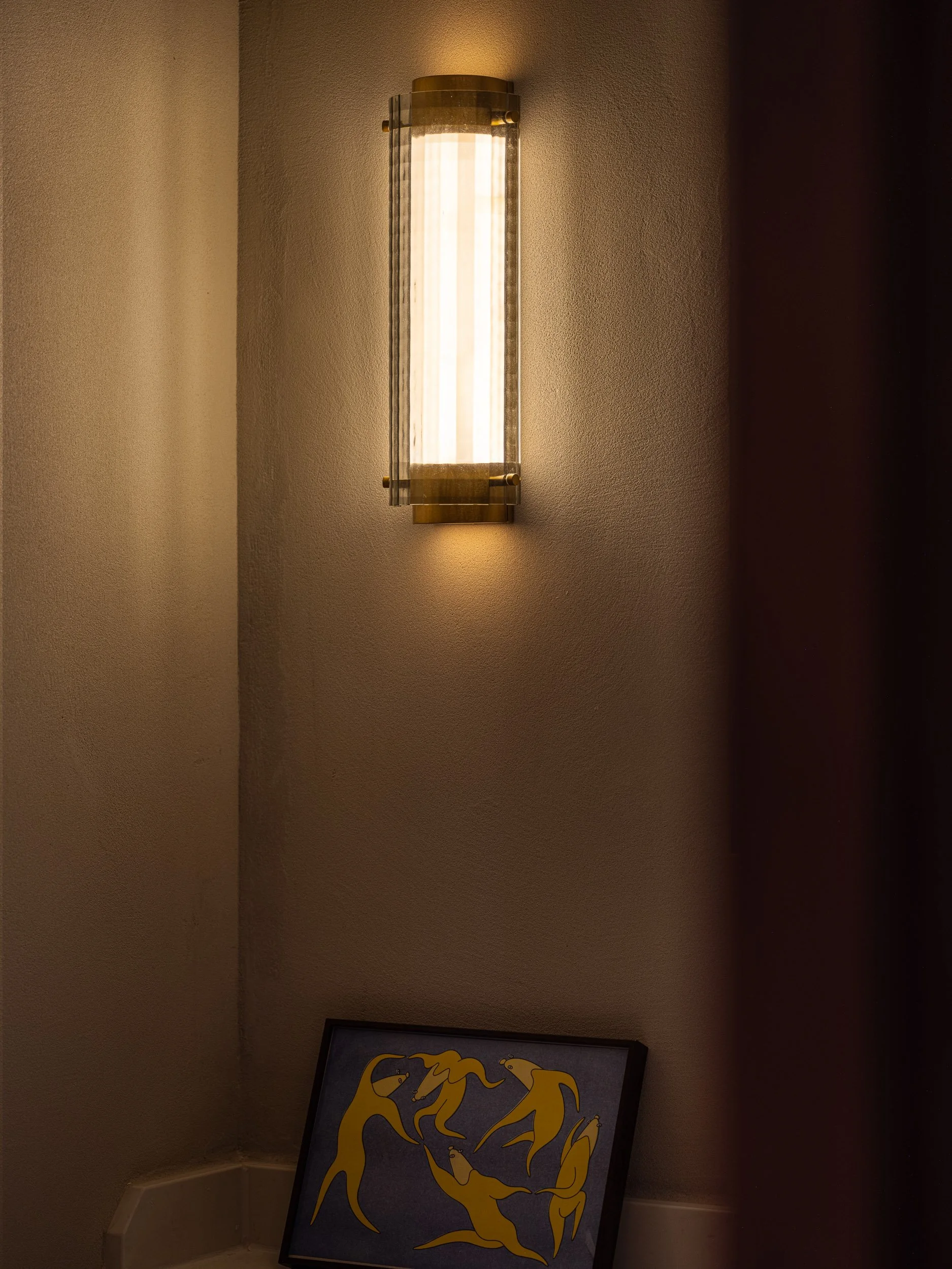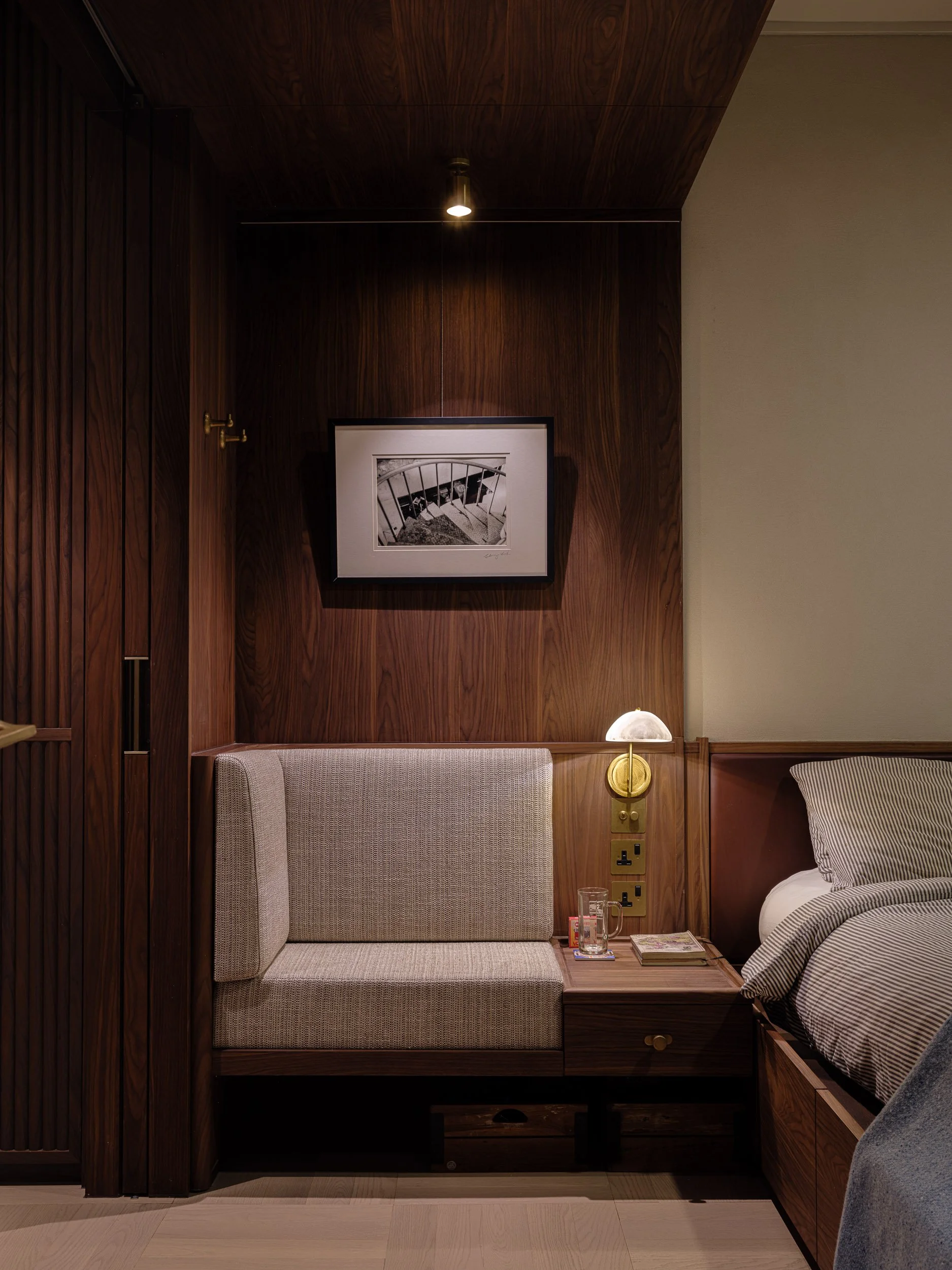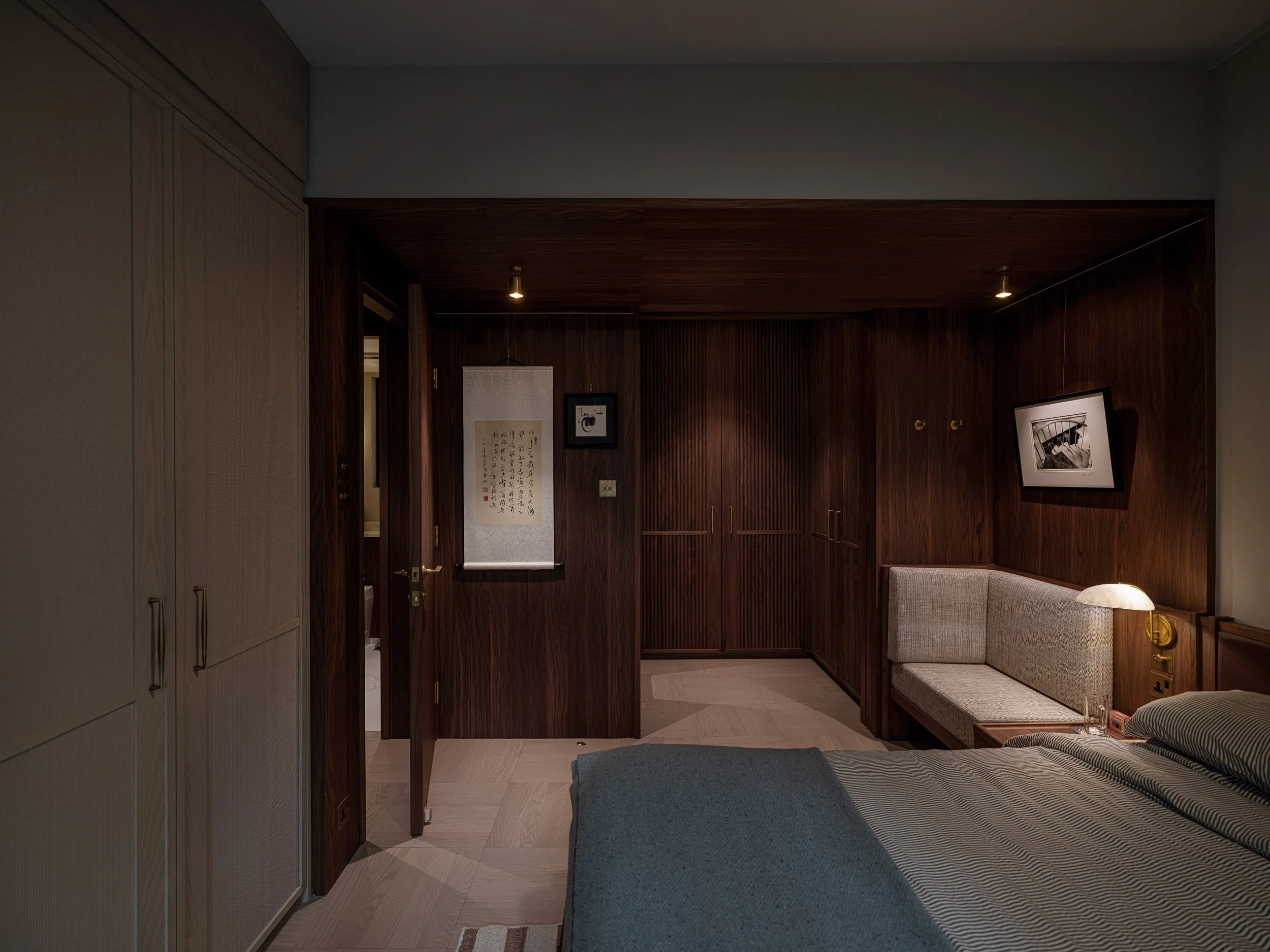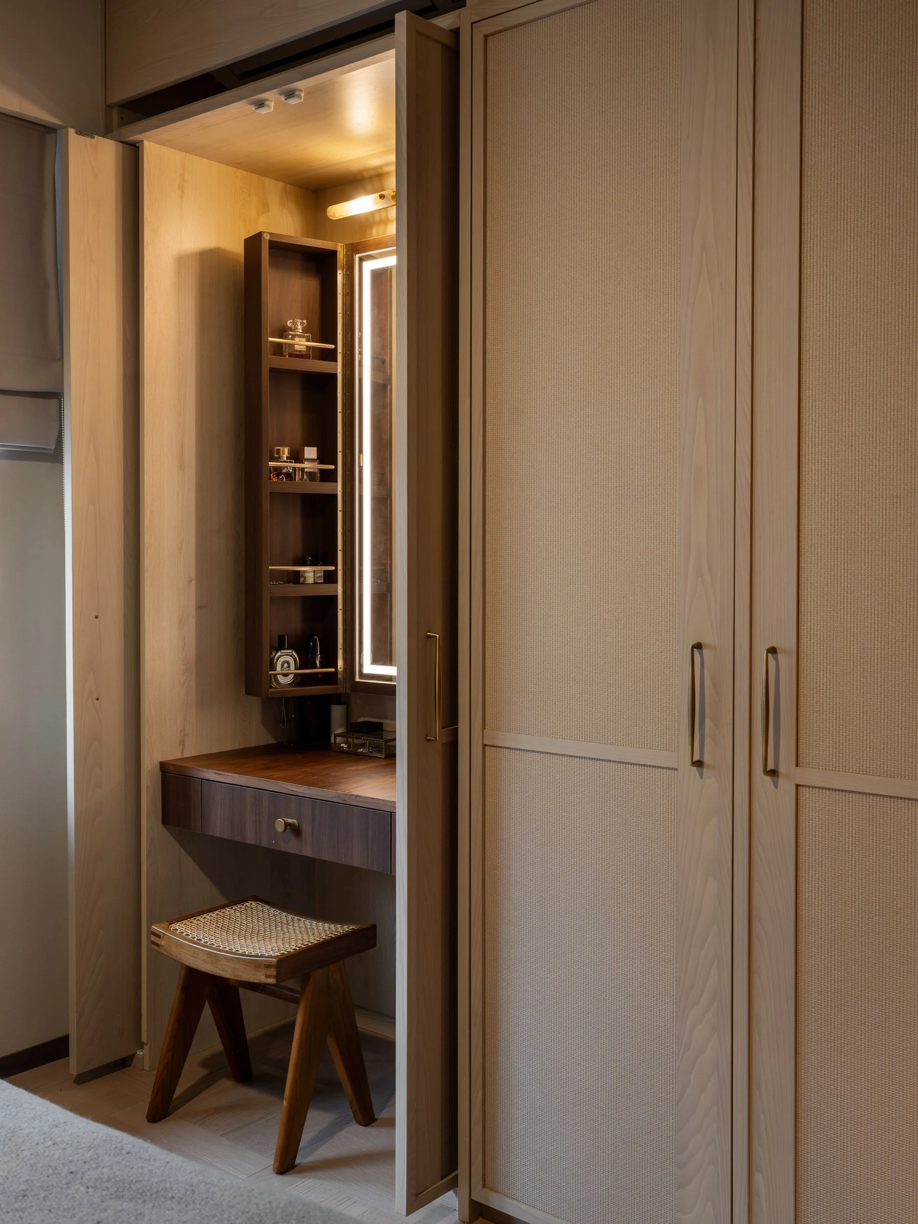 Walnut and brass accents are found throughout. Fluted wardrobe doors with brass handles reveal a hidden walk-in closet, providing a private dressing space. A built-in makeup area, concealed behind light oak doors, features custom cabinets and lighting. The unveiling of the makeup area feels almost theatrical, as if opening a jewellery cabinet.