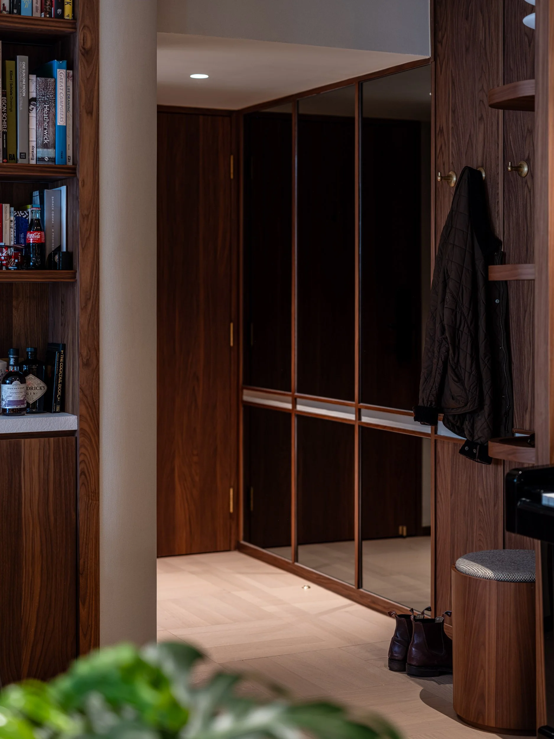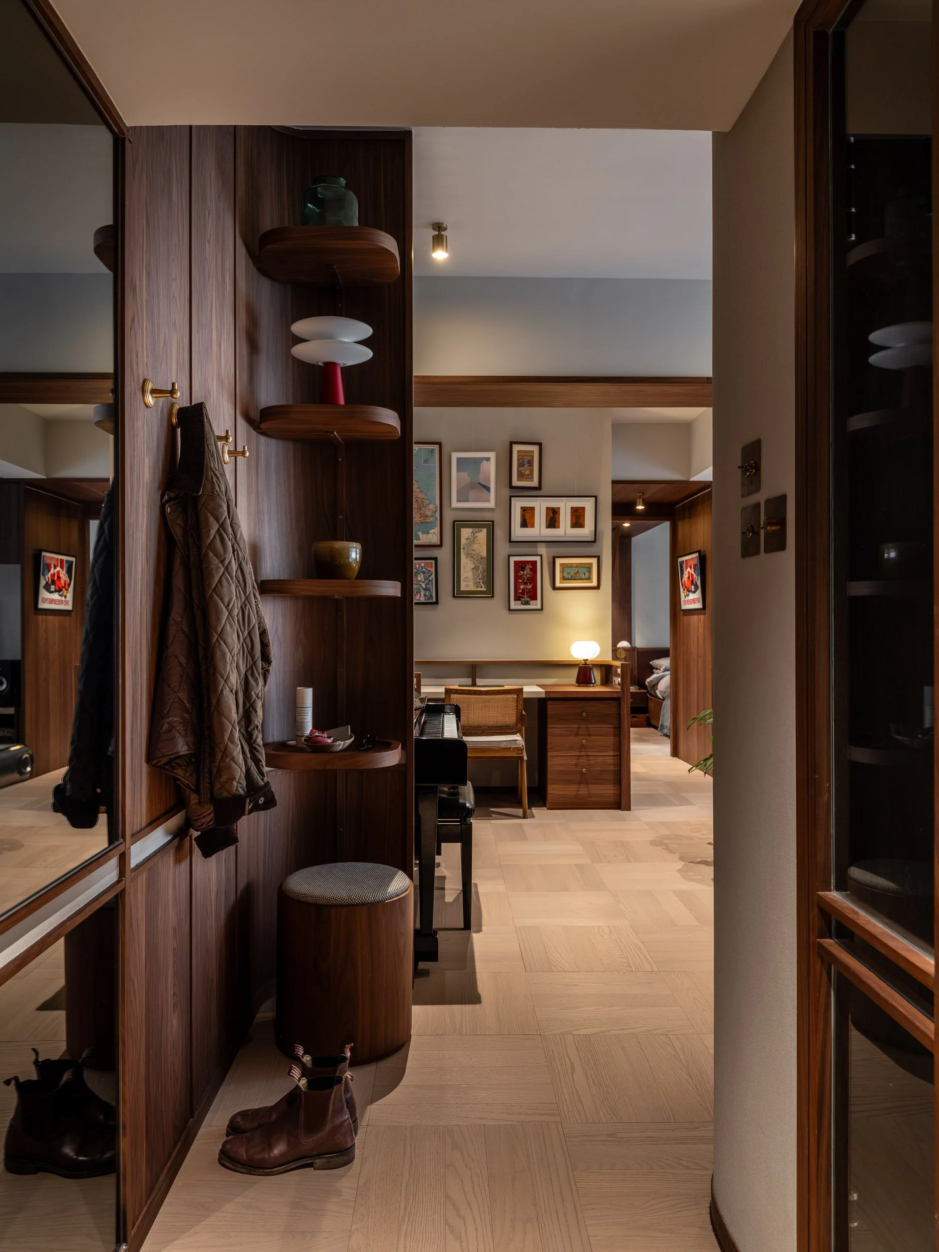 The entrance sets the tone for this artistic home. Full-length mirrors line the wooden parquet hallway, visually expanding the space while offering a convenient spot for a final outfit check. At the end of the hallway, a curved walnut display shelf serves as a semi-partition to the rest of the home, showcasing daily items. A hidden stool beneath the shelf provides a comfortable seat for changing shoes, and brass hooks along the side provide convenient coat storage.