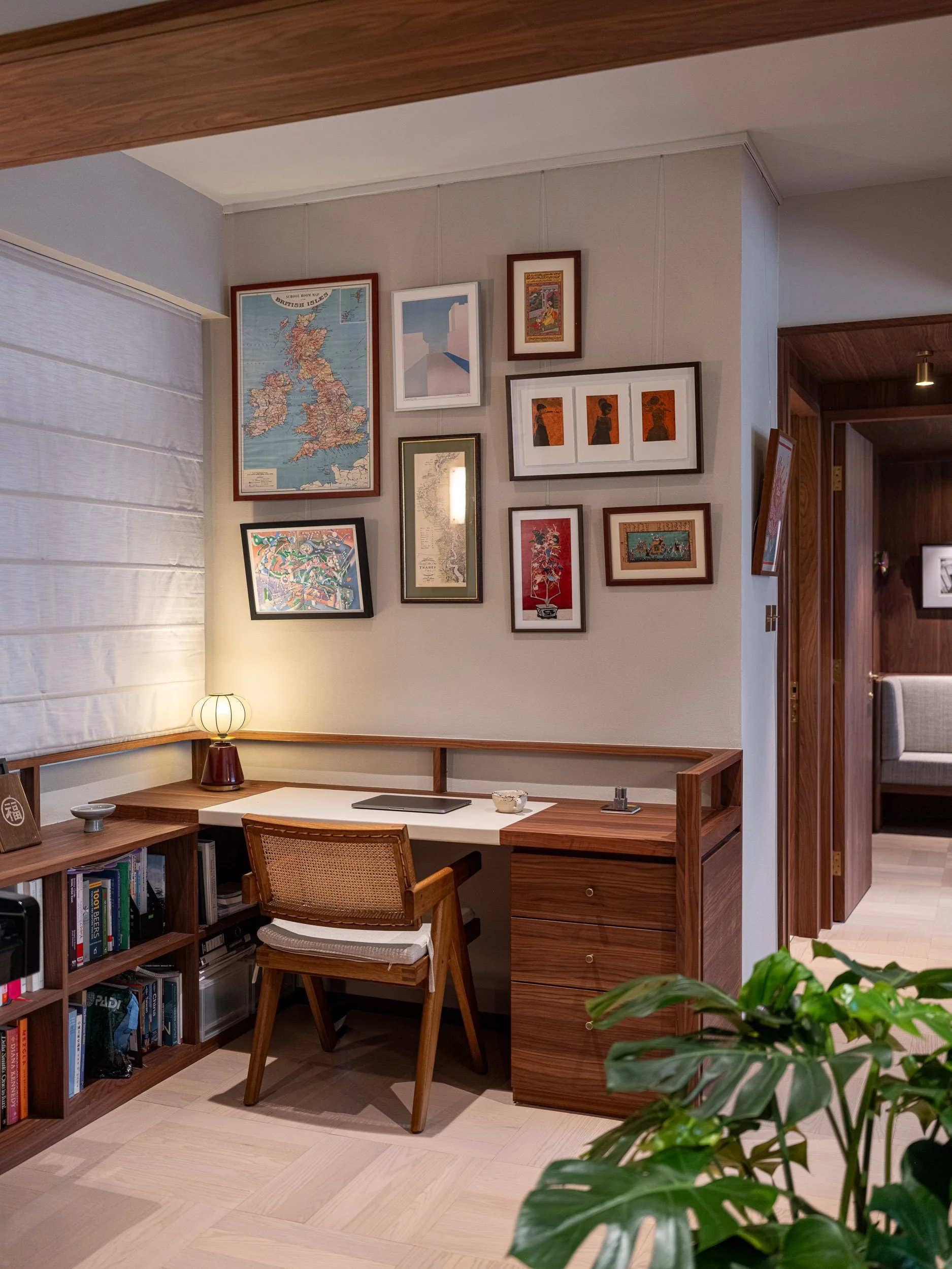 Adjacent to the bookshelf are art work collected during the couple’s travels. Concealed gallery tracks are integrated into the walls, providing a flexible system for rotation and display of their art collection. A built-in work station offers a convenient area for work and creativity.