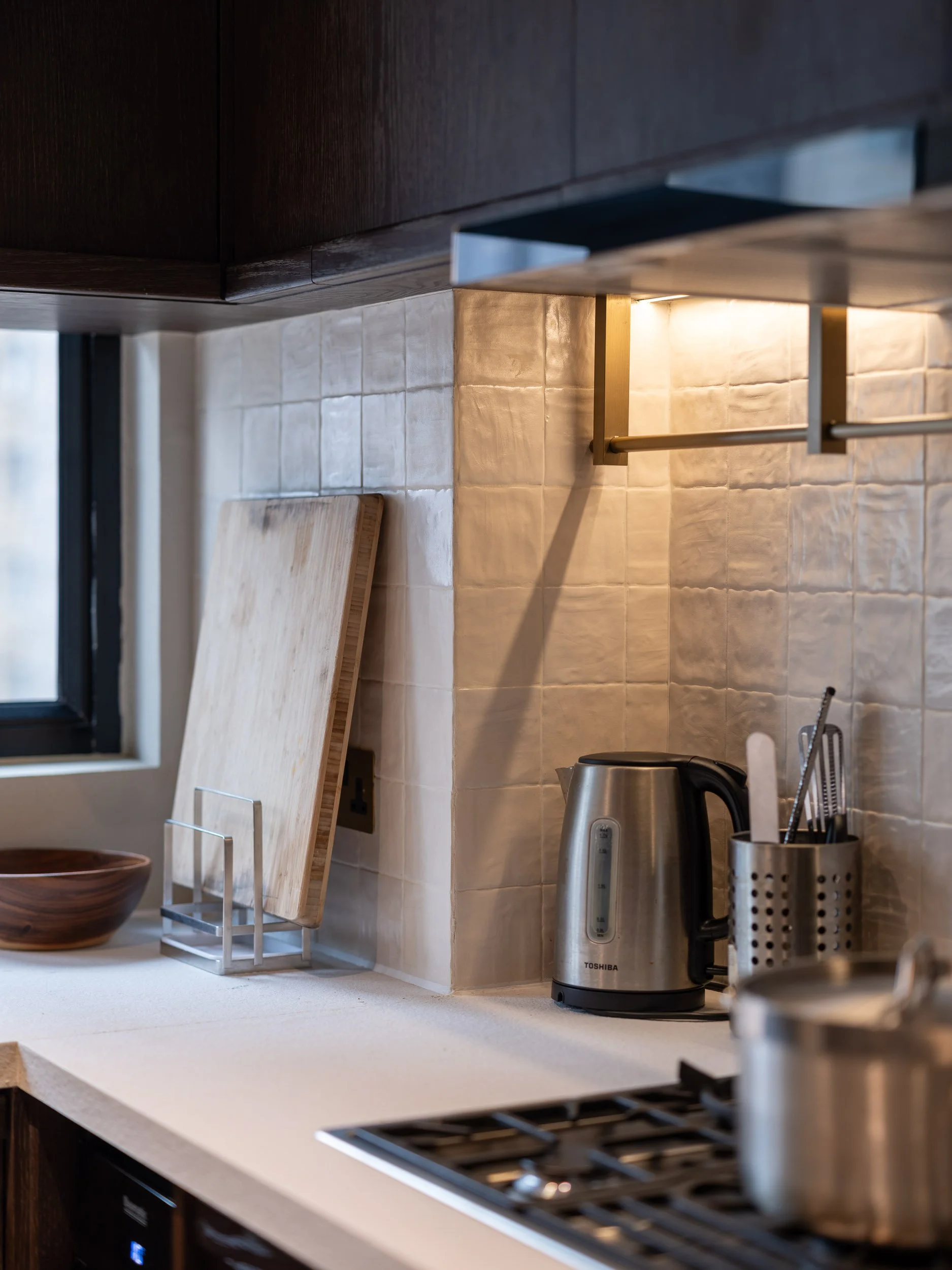 A pantry-style approach has been taken for the dining space, balancing functionality and aesthetics. A long banquet runs along the large windows, with built-in storage discreetly hidden beneath. Walnut-toned furniture, including the iconic Jeanneret chair, completes the dining area, adding a touch of mid-century charm. Bespoke alabaster stone lighting nearby echoes the design’s elegance.