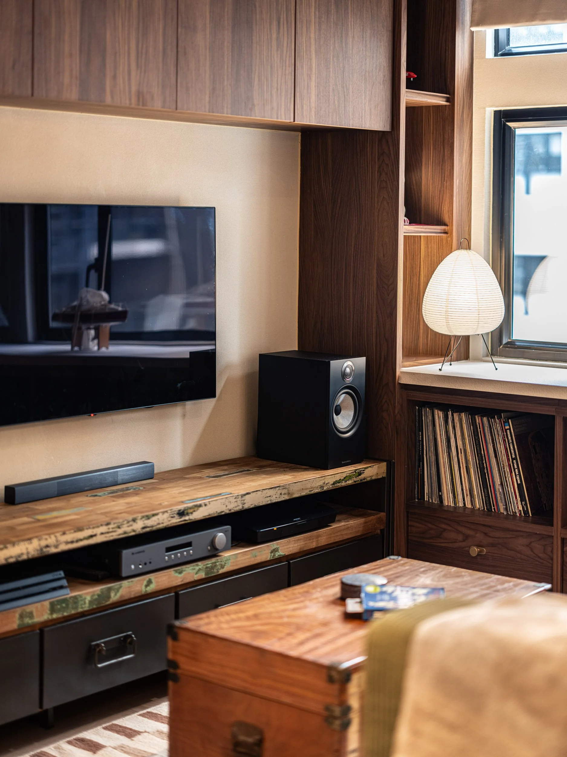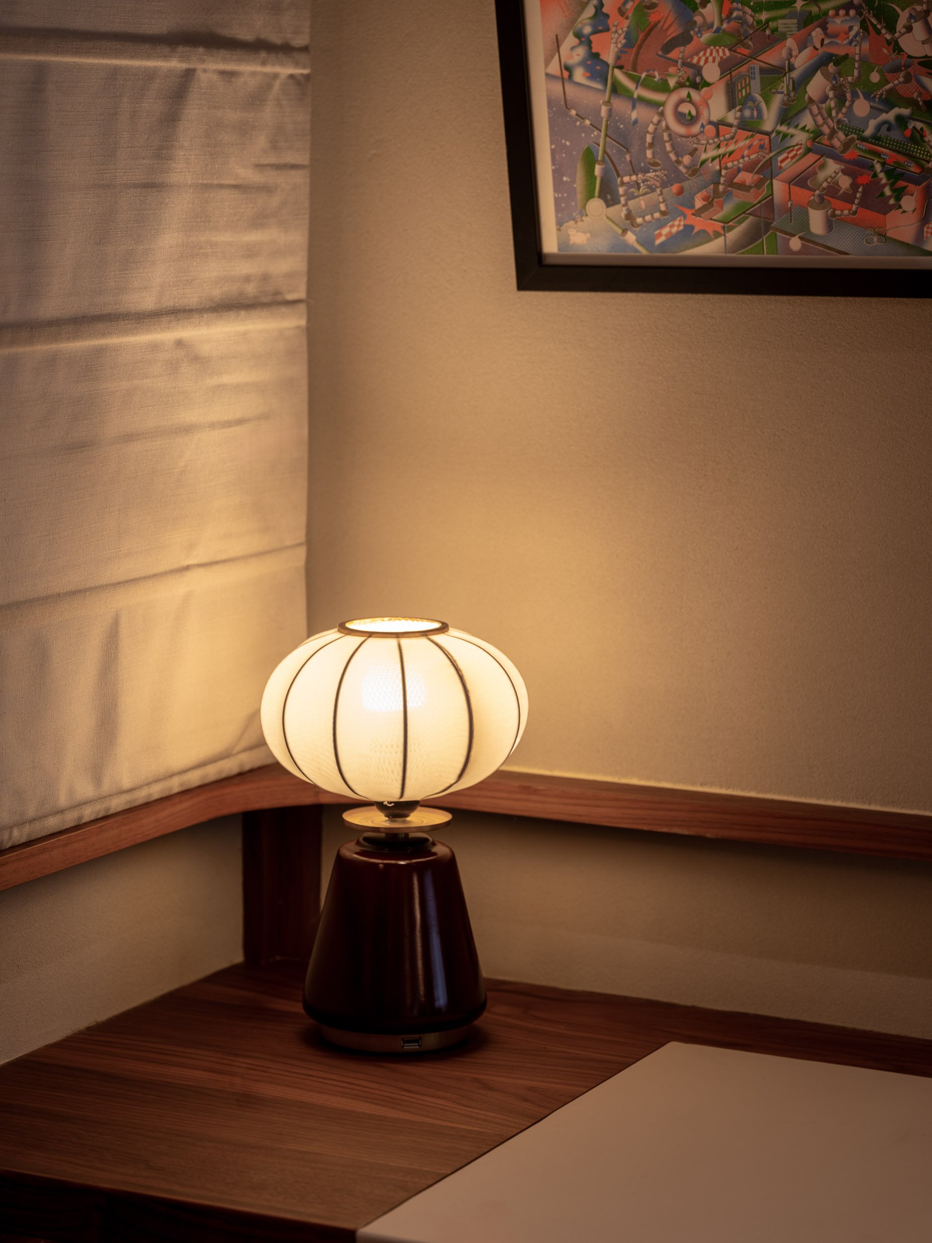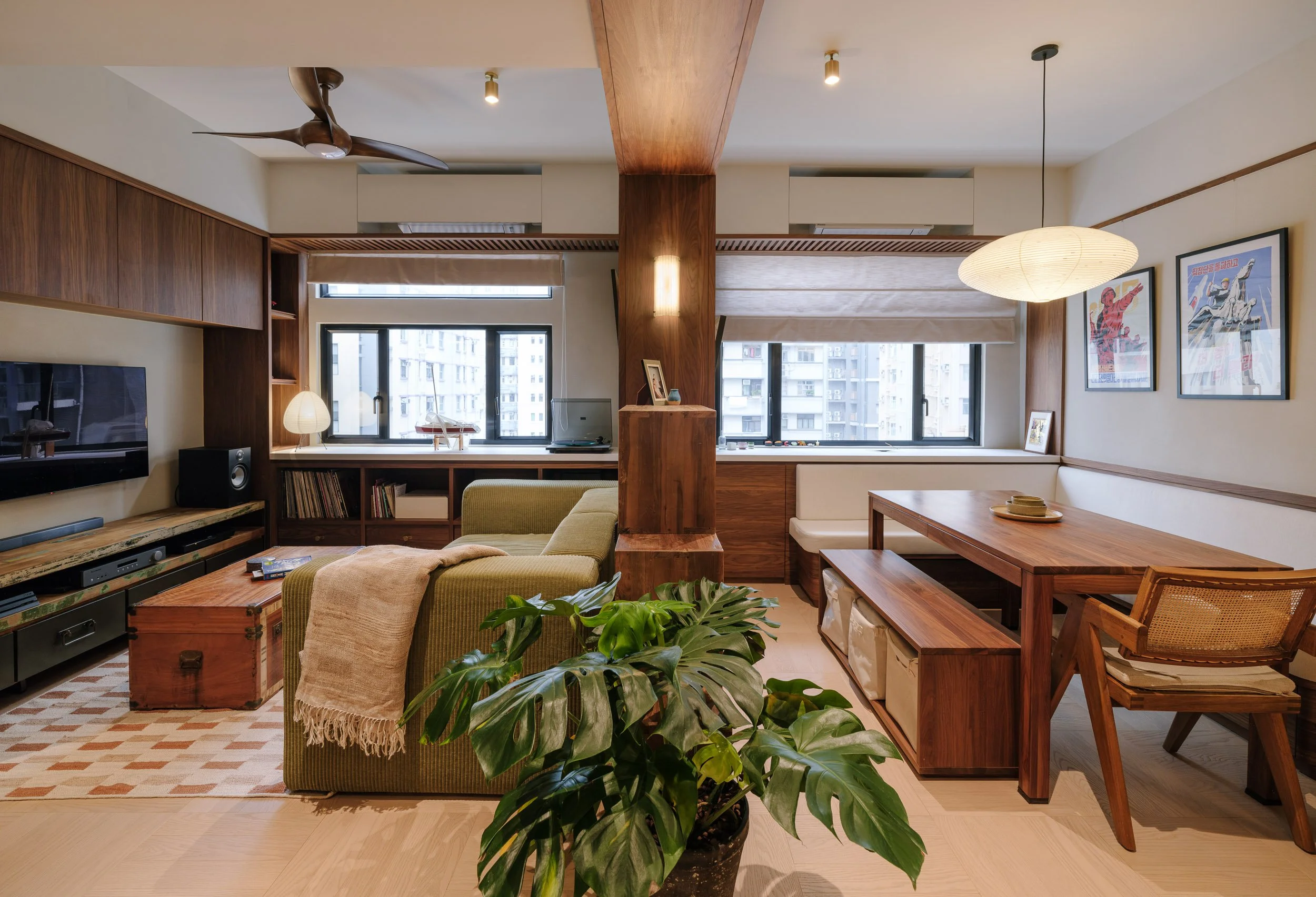 A curated selection of lighting, from Akari Lanterns, to vintage portable balloon lamps, illuminates every corner of the room. Each fixture, with a unique glow and silhouette, is a nod to mid-century design. Chequered wooden floorings evoke the nostalgia of old Hong Kong, reimagined with a new type of wood. A rare touch, a wooden ceiling fan provides natural ventilation to the couple’s liking.