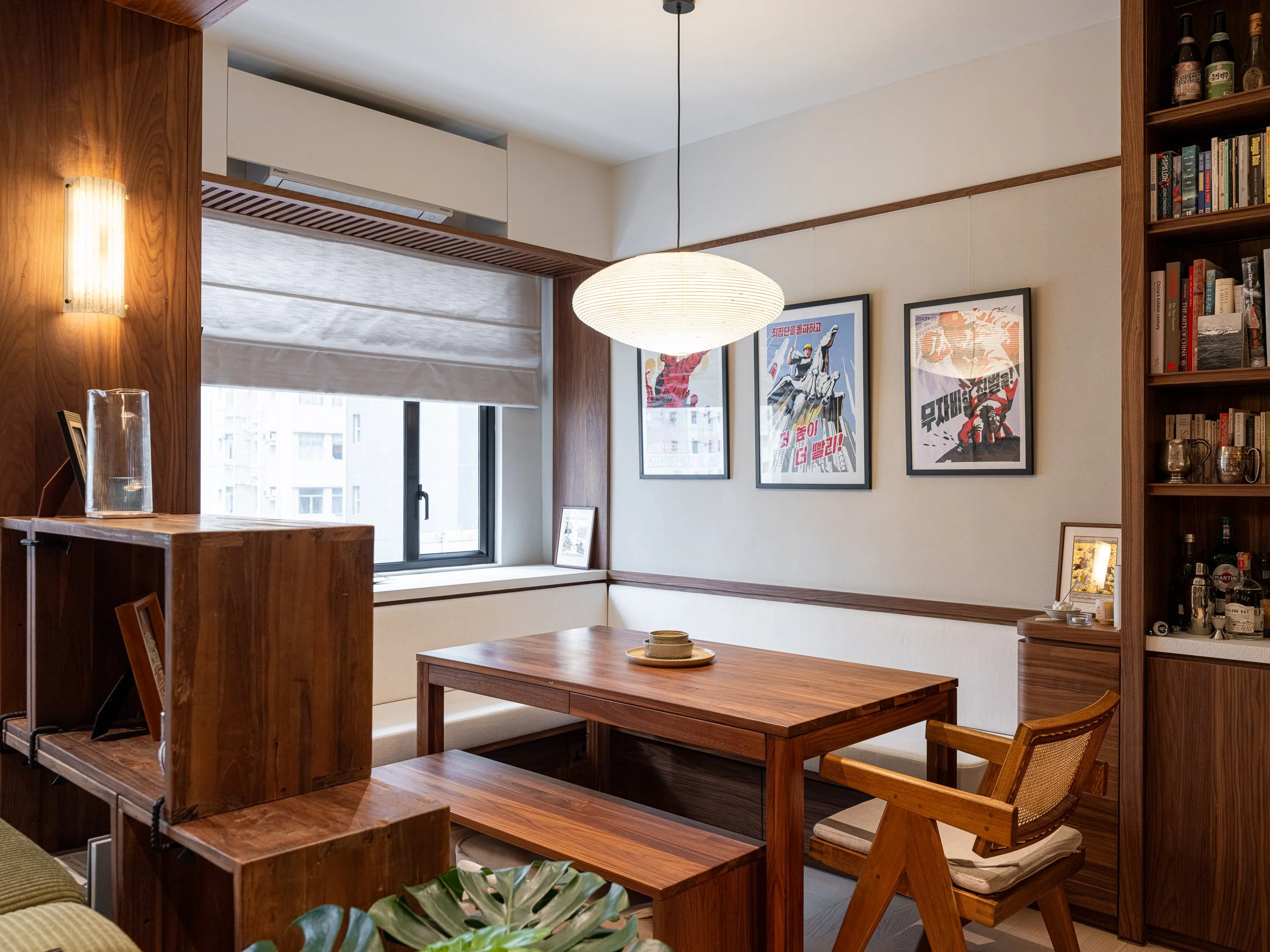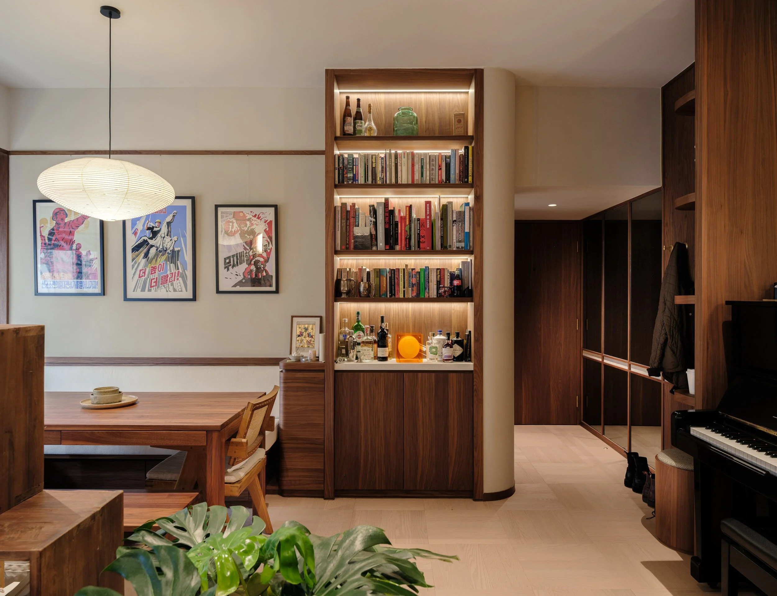 The open-plan living space is thoughtfully divided into the living area and dining area. Upon entering the living area, the eye is immediately drawn to a grand bookshelf, showcasing the couple’s extensive collection of books and spirits. The walls are finished with artisan paint, complemented by wooden veneer details, creating a mid-century modern ambiance.