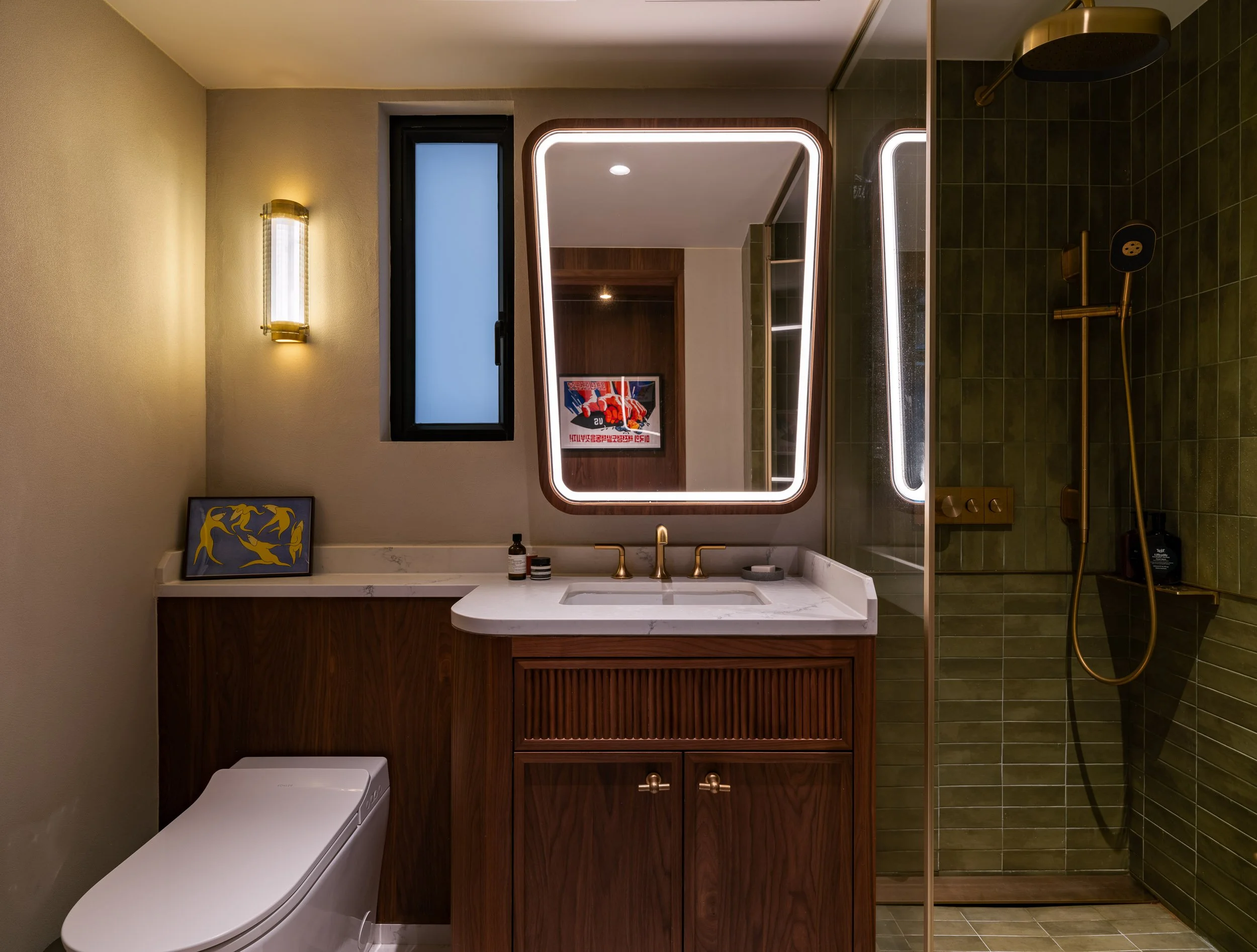 The bathroom is enlivened by a playful splash of colour. Imported olive green tiles are arranged in a dynamic orientation in the shower, creating a vibrant accent wall. Next to the mid-century-inspired mirror cabinet is a textured glass lampshade casting a diffused glow. The bespoke cabinet is decorated with fluted details, echoing design elements found throughout the residence.