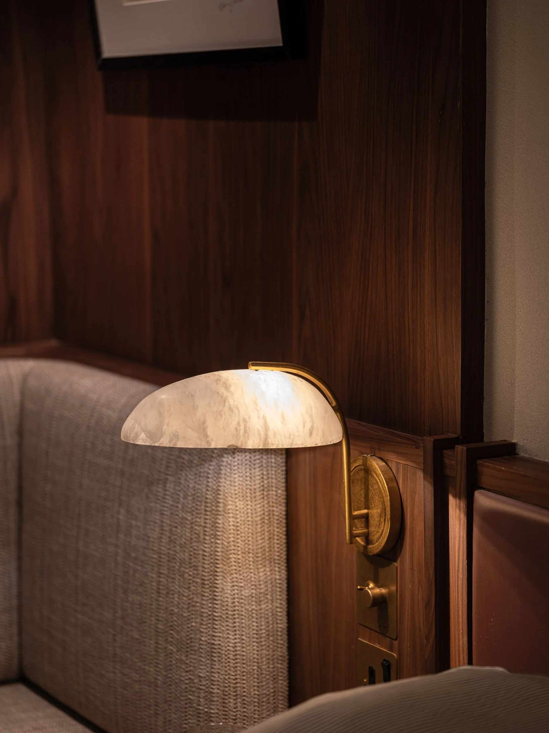 A distinct ambiance defines the bedroom. One is welcomed by a grey fabric sofa with grey fabric upon entering, extending from the headboard. The soft glow of an alabaster bedside lamp makes it the perfect setting for late-night reading. The headboard’s burgundy, organic leather juxtaposes beautifully with the dark walnut, adding a layer to the room’s serenity.