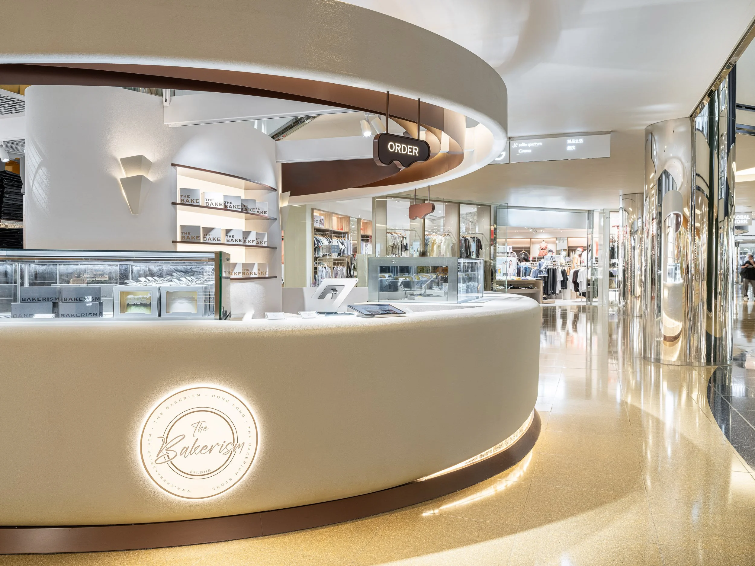The pop-up’s exterior features textured walls in melting cream hues, their soft yellow-to- brown gradient mirrors both the gentle melt of snow and The Bakerism’s layered cakes. A signature bronze seal decorates the front of the structure, marking this as a destination for indulgence.