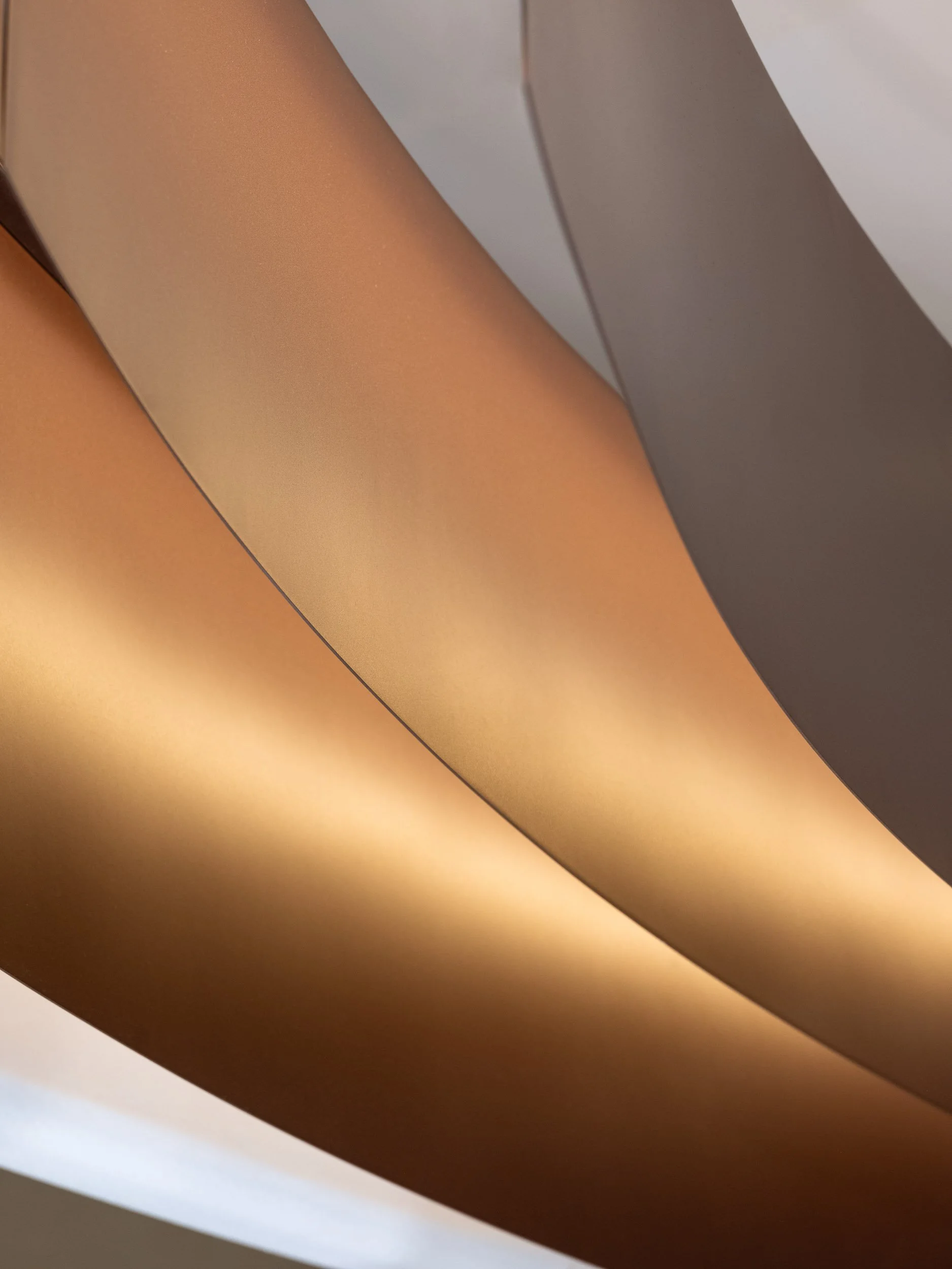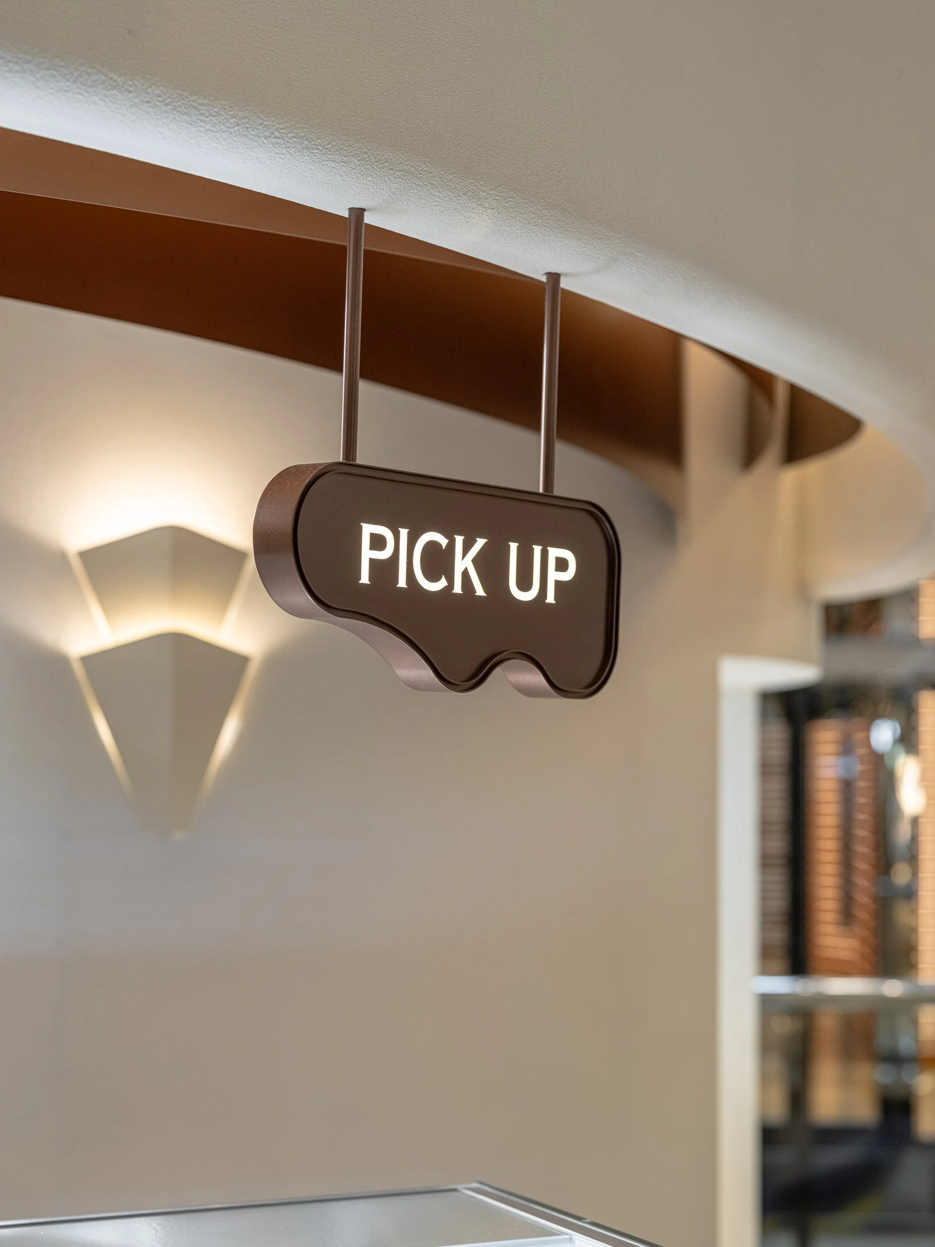 Signages are a major element for a clear presentation to visitors. Melting bronze signs, one of the brand colours, guide guests between ordering and pickup areas, hanging below the snow-inspired ceiling to complete the thawing snow scene.
