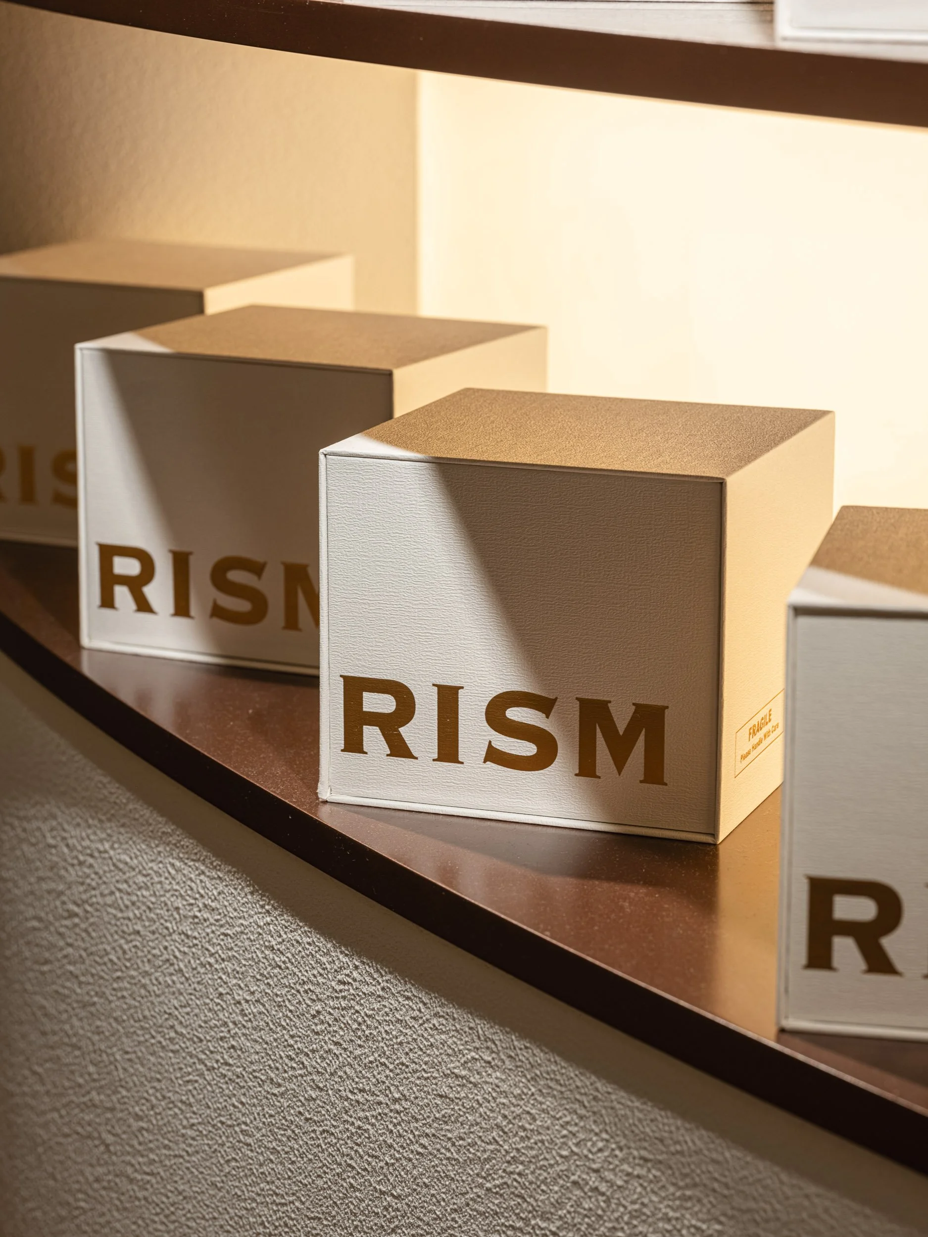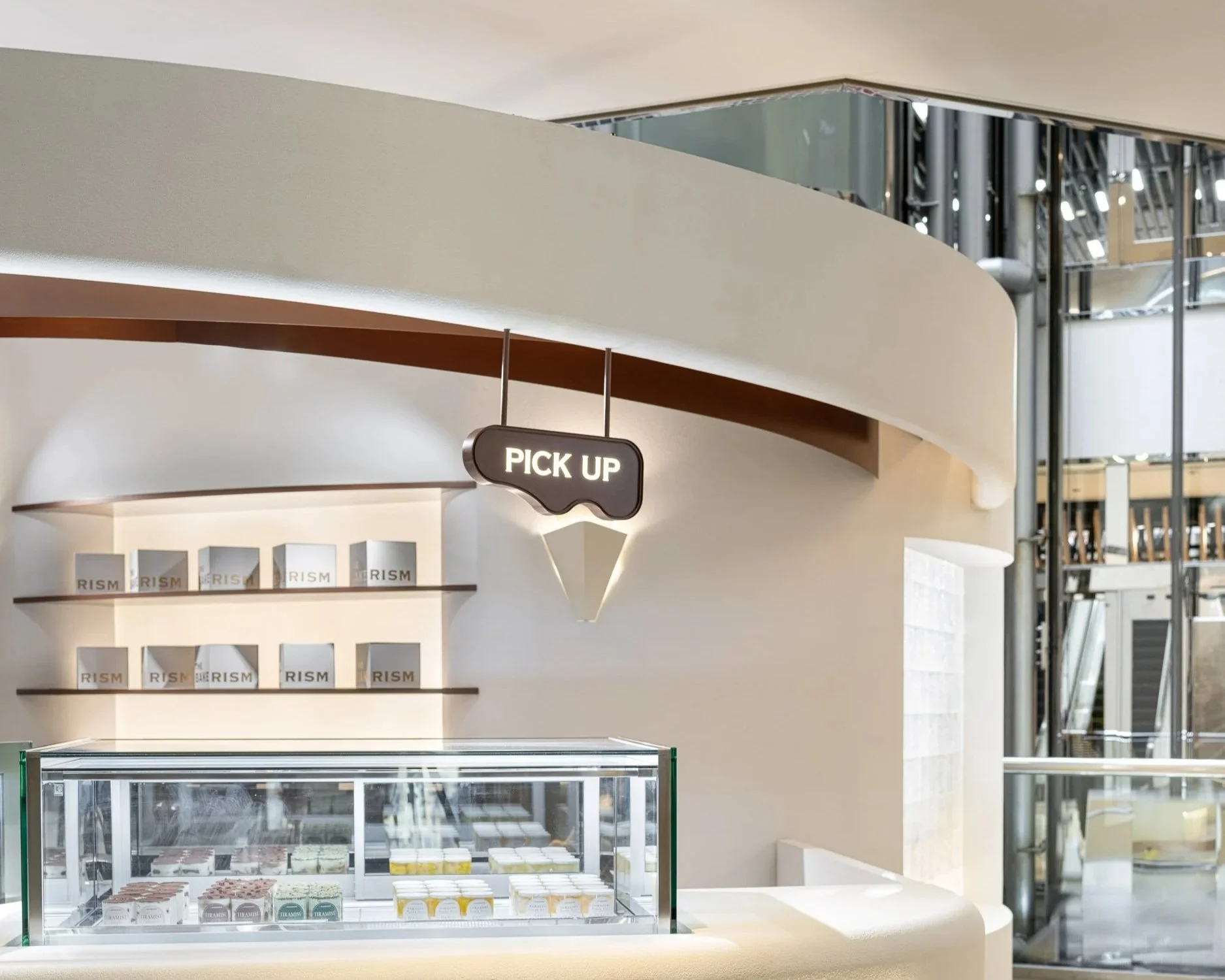Inside, backlit glass bricks glow with a delicate warmth. Their crystalline radiance captures both fresh snowfall and the brand’s luscious cakes. Every material selection, from transparent surfaces to tactile finishes, create an environment where the patisserie becomes a delicate and inviting sensory experience.